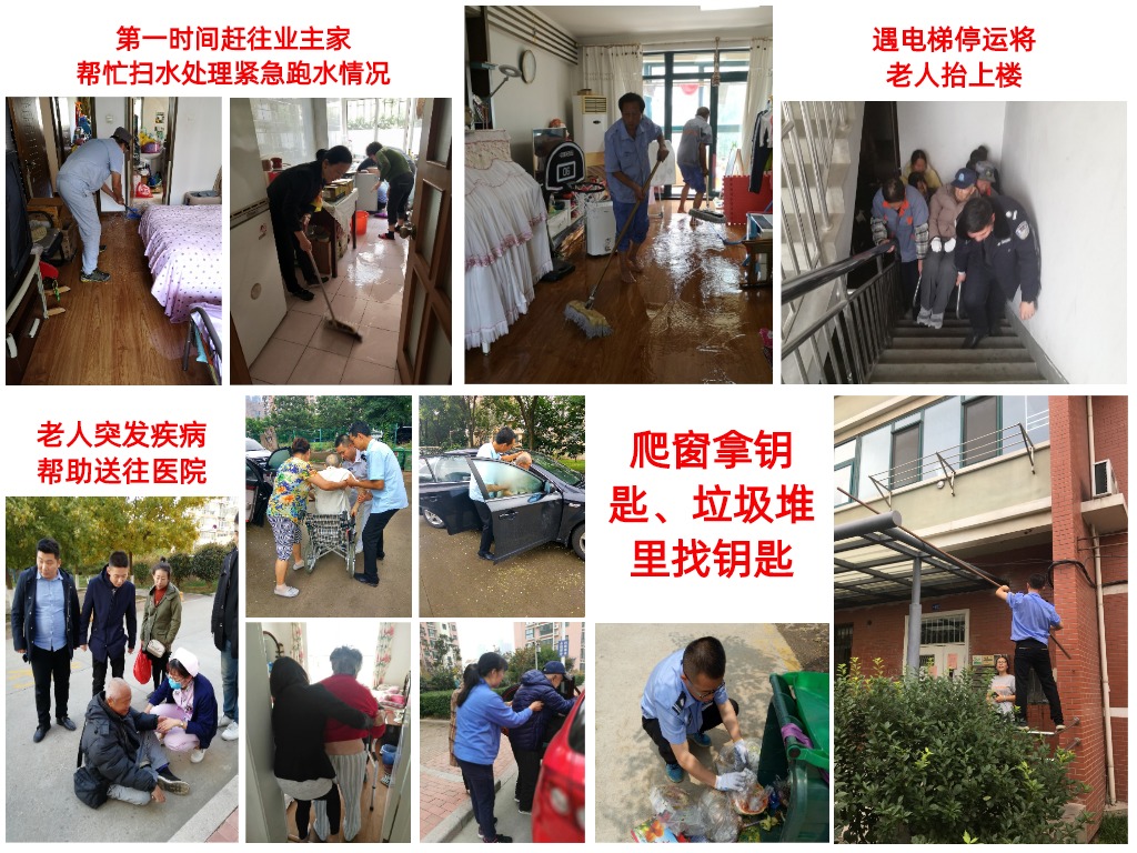居家过日子,免不了有这样那样需要帮忙的事情,虽然都不是合同约定的服务内容,但是锦绣人没有份内份外的概念,只要是业主需要,就全力以赴。不管业主求助到谁,第一个接手的,要负责到底。这是公司的首问负责制度。业主家跑水了,物业组织去扫水;老人突发急病,物业帮助送到医院;遇到电梯维修,物业把行动不便的老人背上楼;业主把钥匙落到屋里,物业爬窗进去拿;孩子暑假没有照管,物业出场地、出人帮助照管。久而久之,就在业主中间流传着这样一句口头禅:“有困难找物业”!