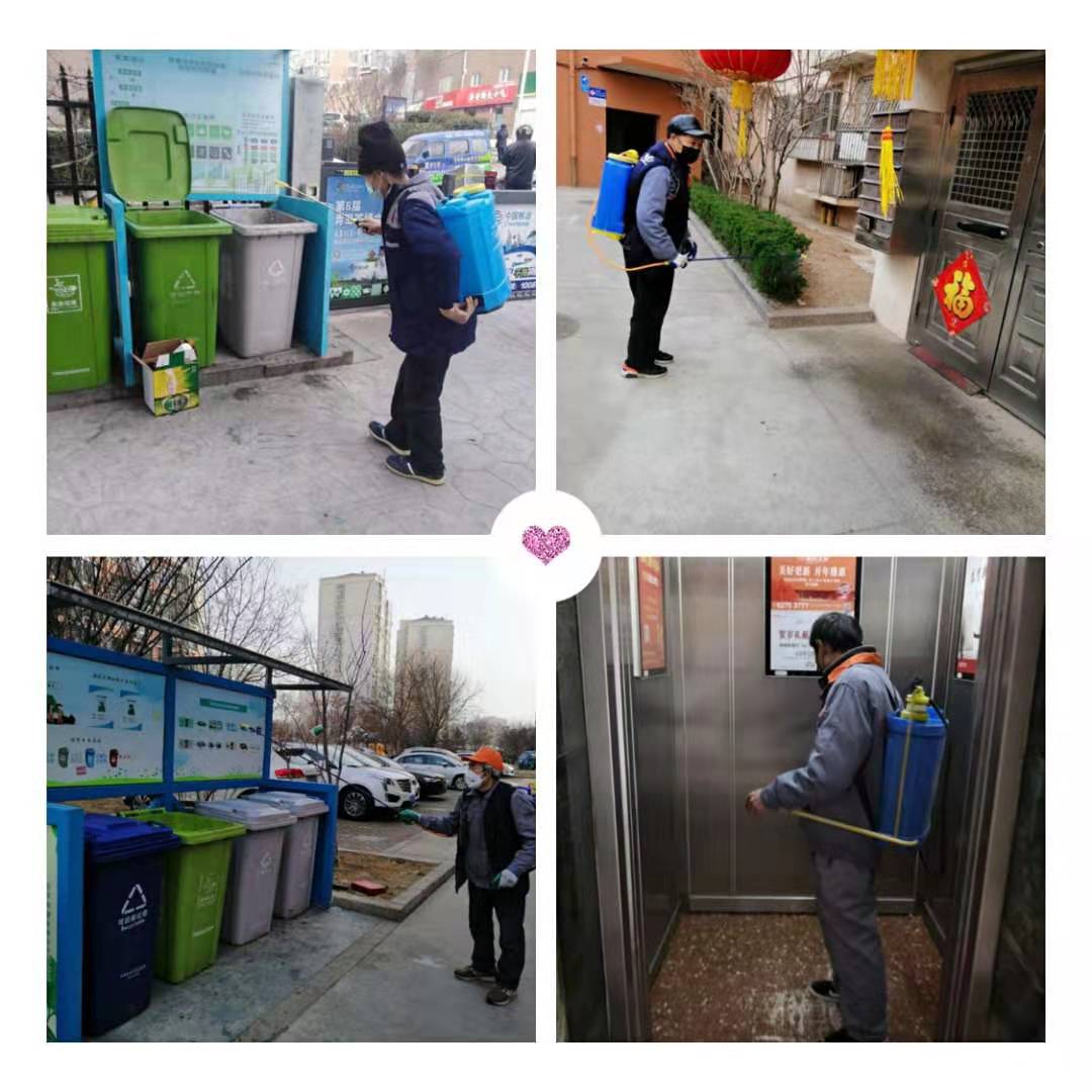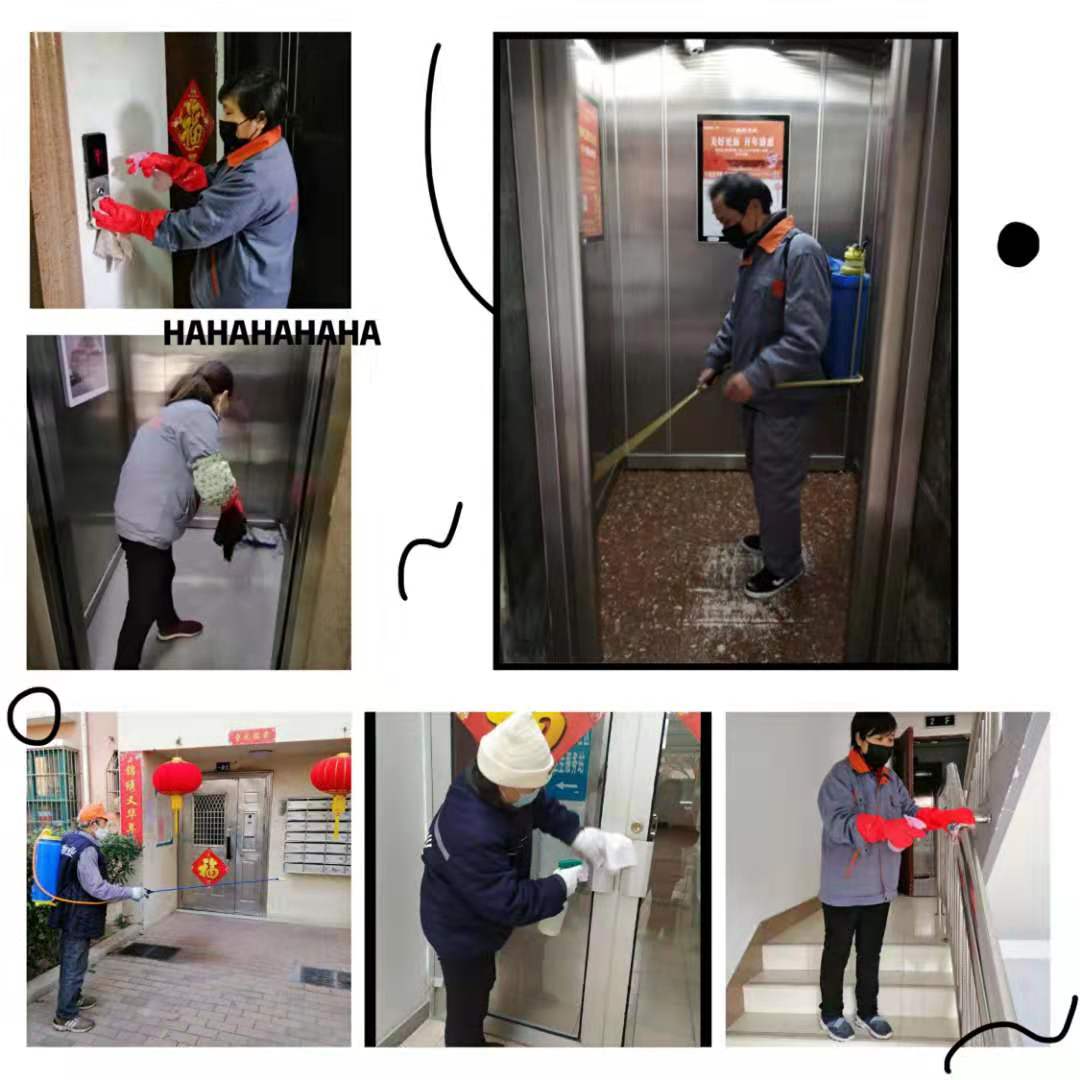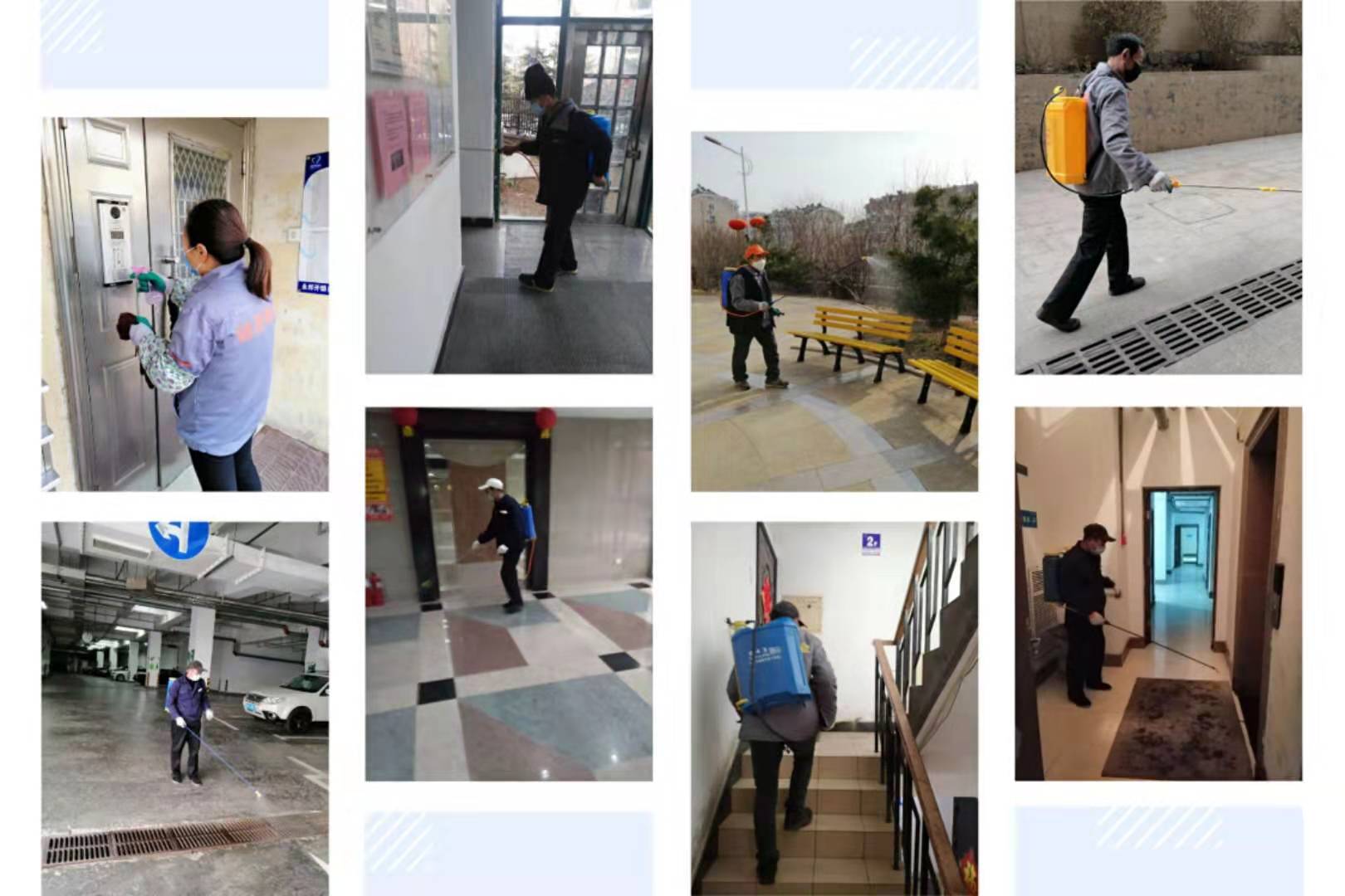 各单位迅速组织员工开展一场防疫、防控保卫战,从环境卫生开始,在前期清扫基础上,再次组织带消毒液进行清理;对电梯、地库、楼道、单元门、门窗等重点部位,每天两次以上进行消毒;要求全体员工严密做好个人防护上岗,杜绝疫情苗头滋生。