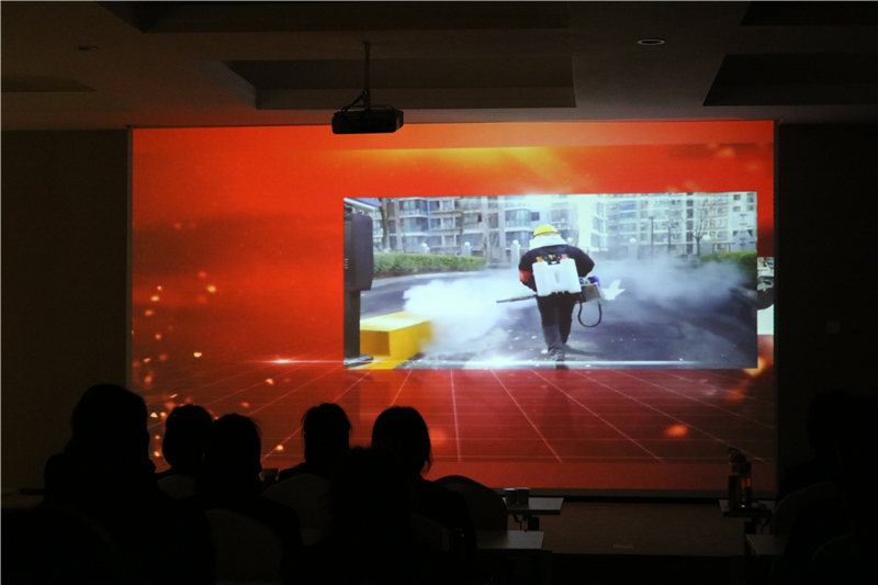 全体参会人员共同观看锦绣人奋战防控一线精彩画面视频。
