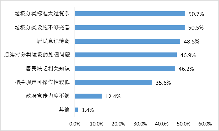 针对上海推进生活垃圾分类的主要困难,受访市民认为排在前三位的分别是“垃圾分类标准太过复杂”“垃圾分类设施不够完善”和“居民意识薄弱”,选择比例为50.7%、50.5%和48.5%。此外,还有四成左右的市民选择了“后续对分类垃圾的处理问题”“居民缺乏相关知识”和“相关规定可操作性较低”,仅有12.4%的上海市民选择了“政府宣传力度不够”。